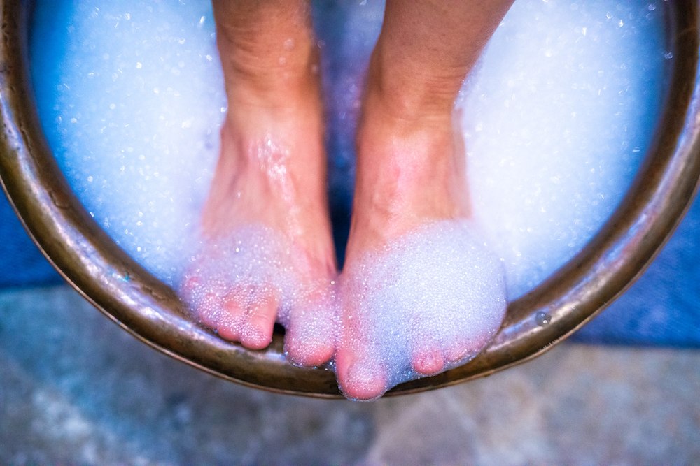 A soothing foot treatment including a foot bath, exfoliation, removal of hard skin, nail trimming and filing.